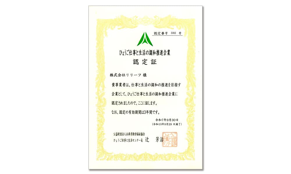このたび、株式会社リリーフは、社員の仕事と生活の調和(ワーク・ライフ・バランス)推進に向けた取り組みが評価され、兵庫県より「ひょうご仕事と生活の調和推進企業」として認定を受けました。