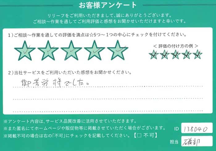 この度は、遺品整理リリーフ関東事業所のおかたづけサービスをご利用いただきまして誠にありがとうございました。