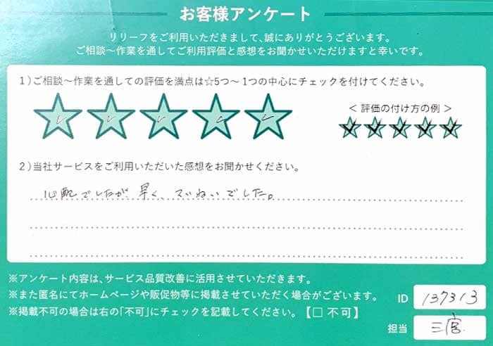 「心配でしたが、早くていねいでした」とのお言葉、そして星5つの高い評価をいただき、スタッフ一同、大変嬉しく思っております。