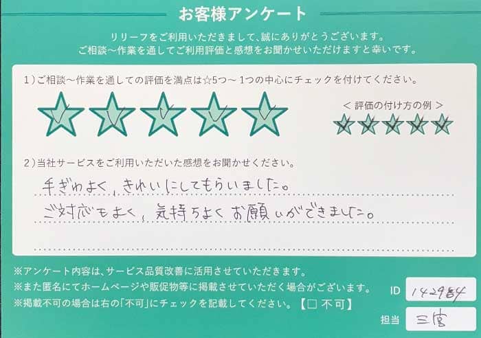 この度は、遺品整理リリーフ 関東事業所 京浜支所のおかたづけサービスをご利用いただきまして誠にありがとうございました。